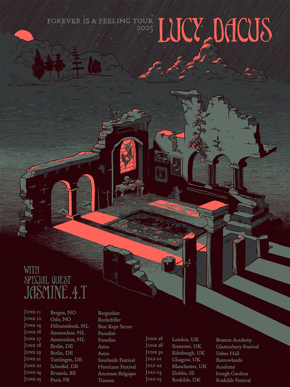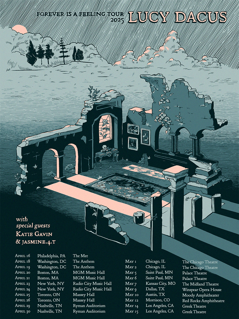Two color ways of a tour poster from earlier legs of 2025, based on the classical and architectural themes of the album campaign. Inspired by the serialized renaissance Annunciation paintings, which usually depict a space that is simultaneously inside and outside, illustrating the meeting of secular and celestial. I imagined this space as ruins that have partially endured the passing of time, as a reference to the title of the tour/album, "Forever is a Feeling."