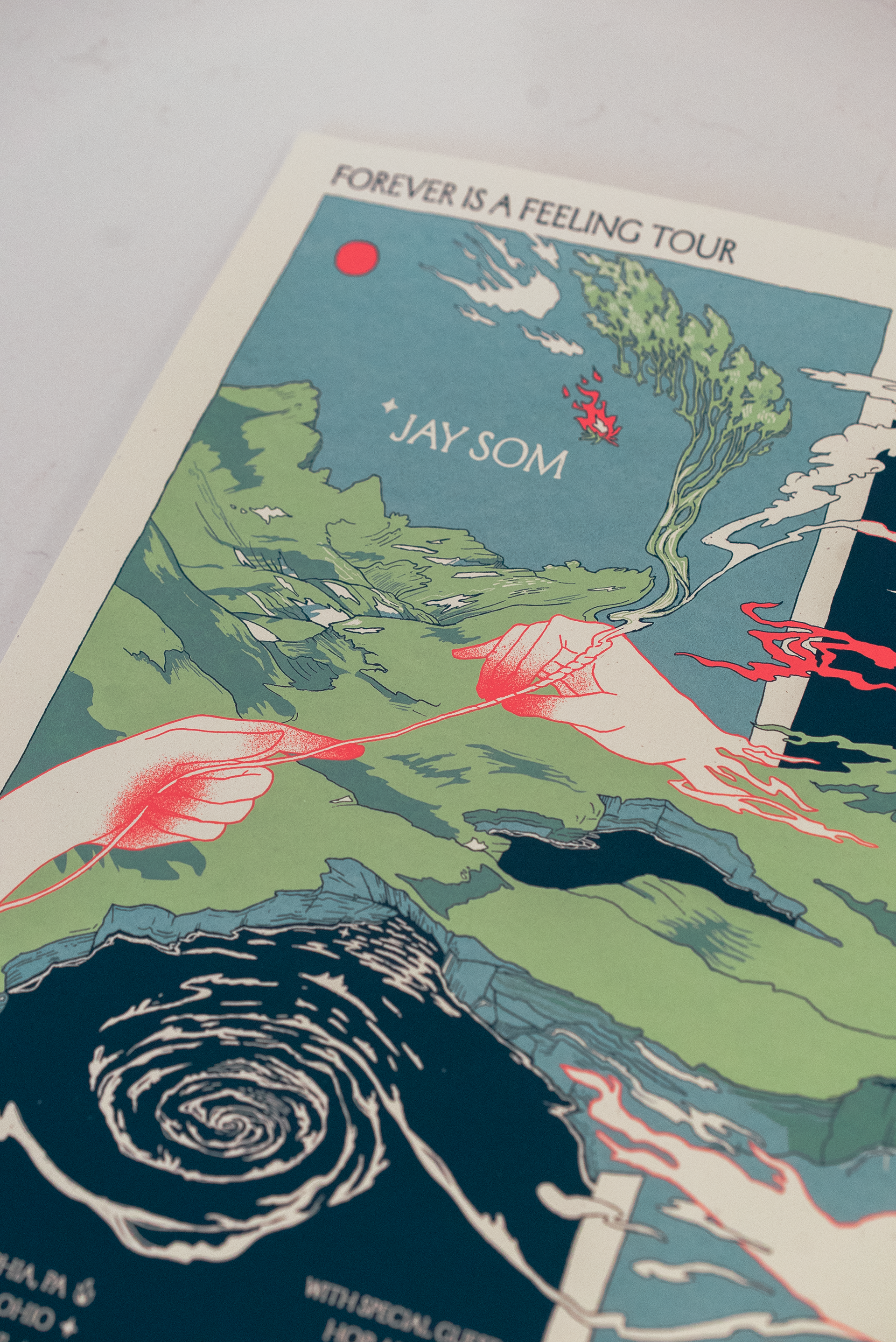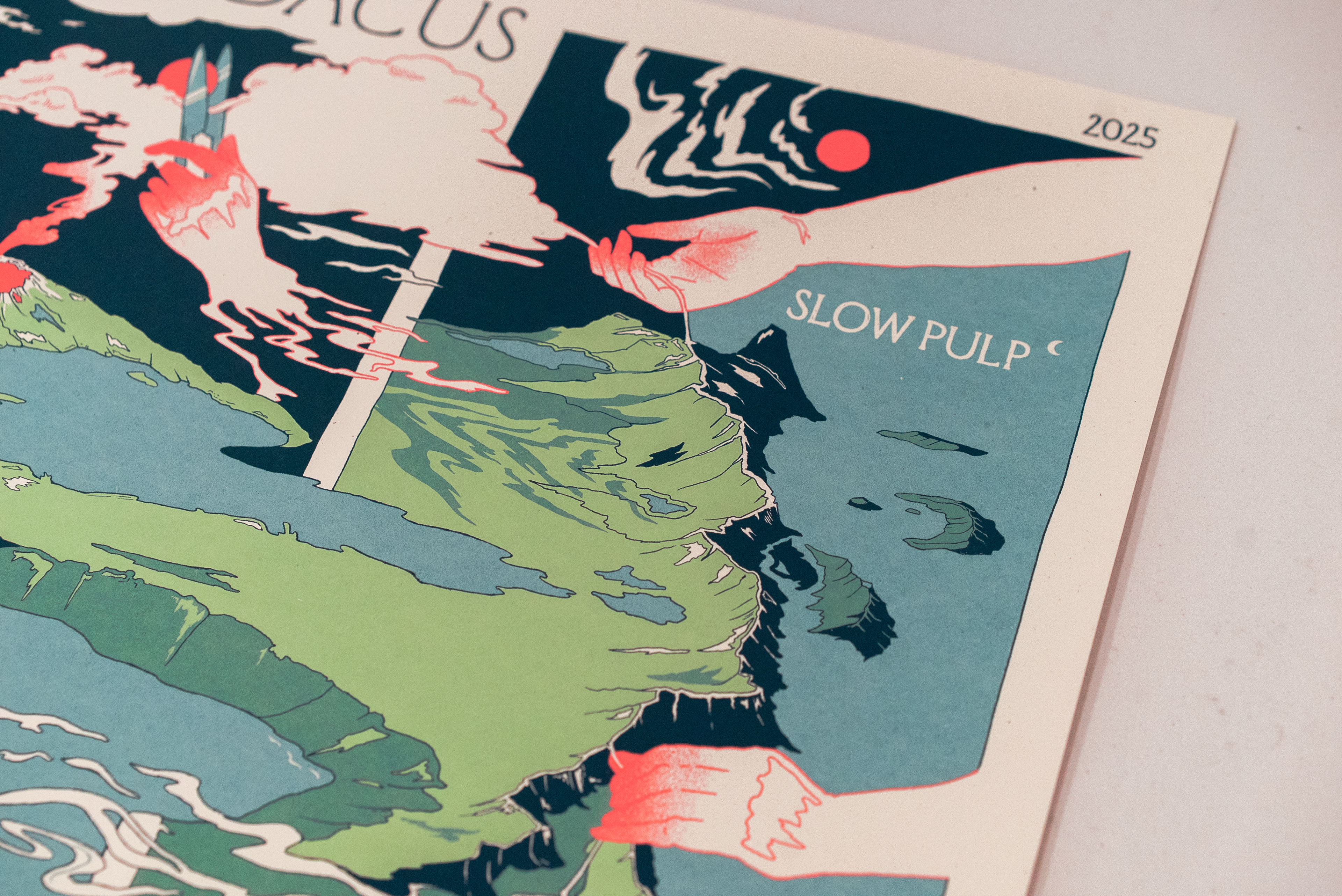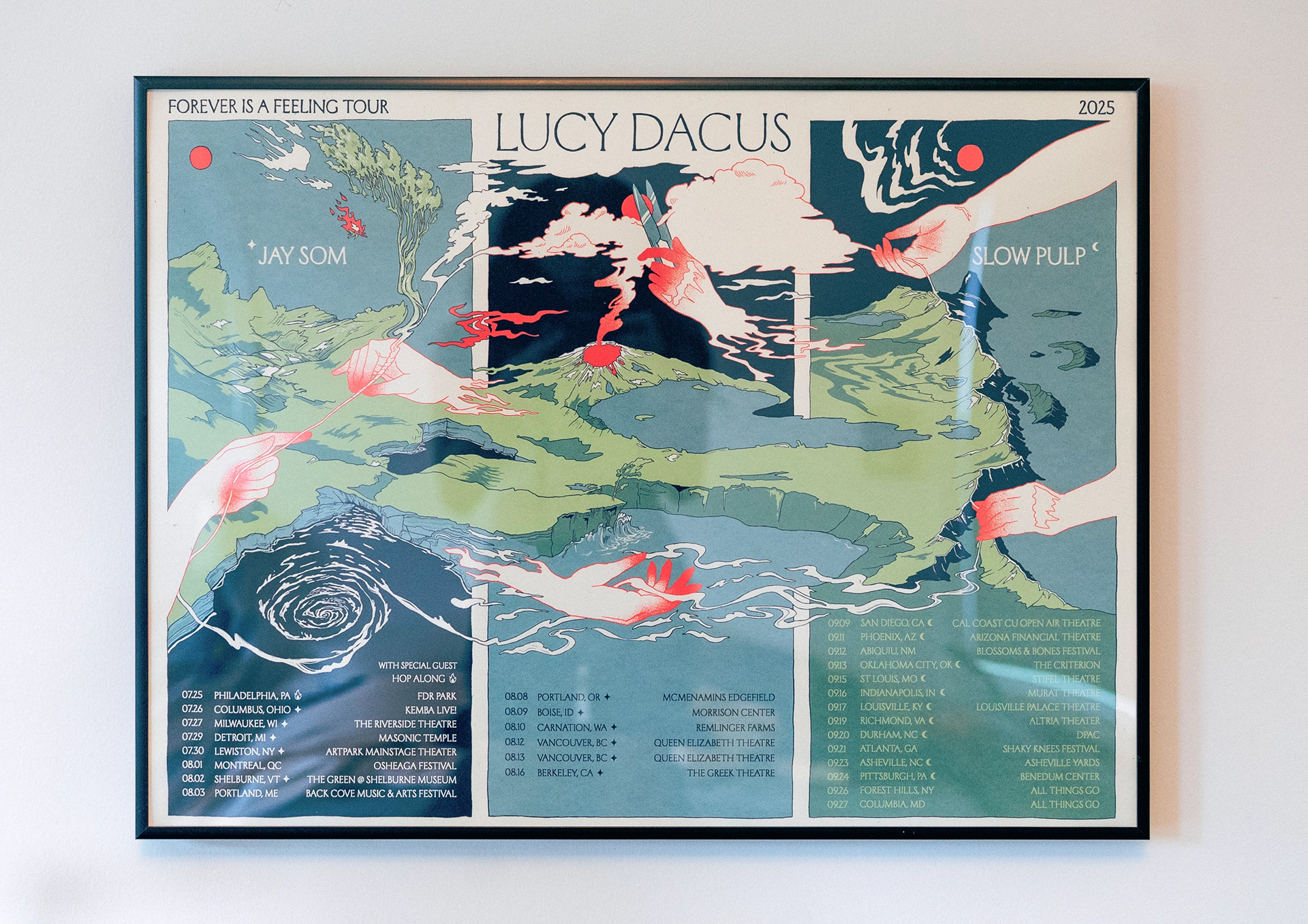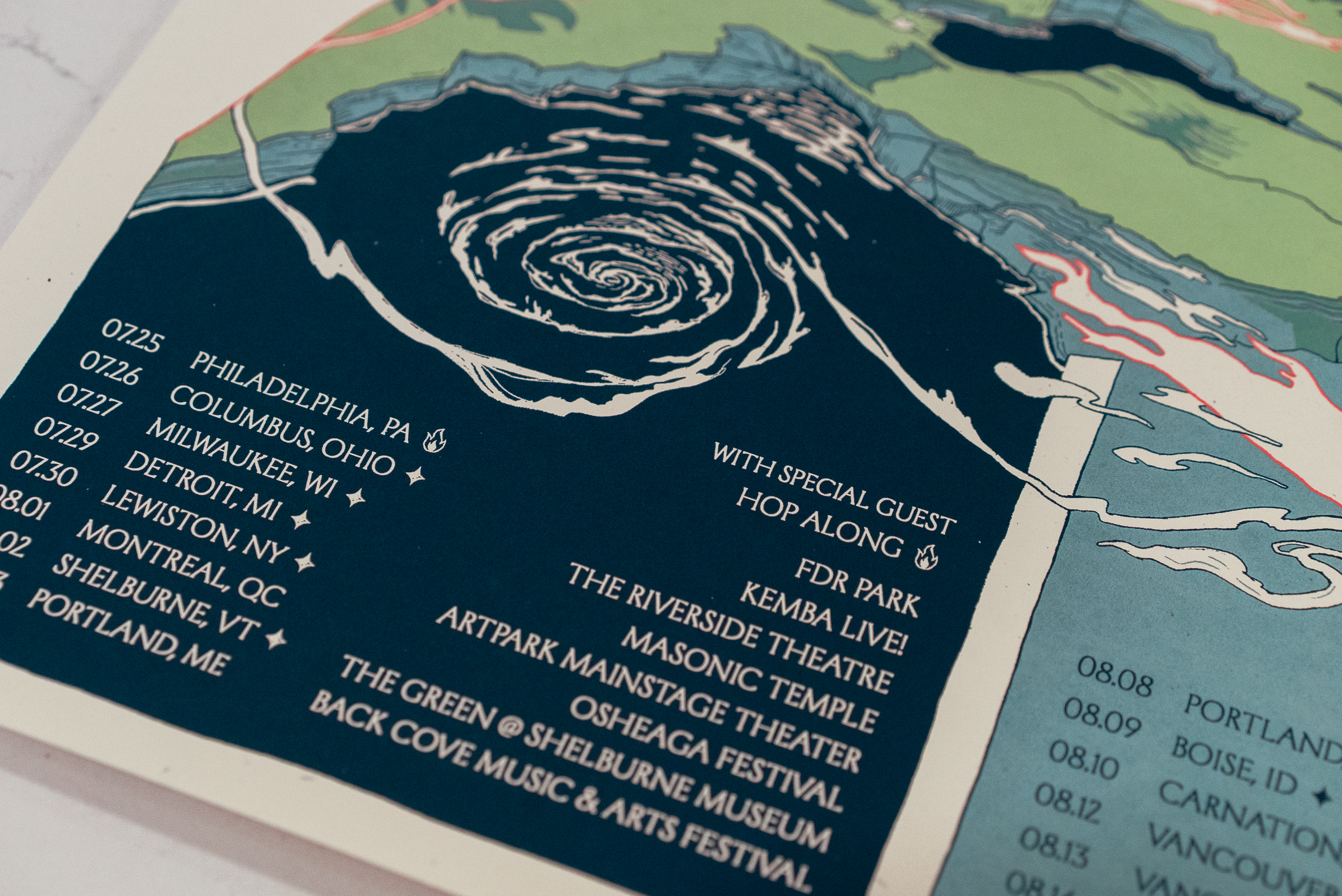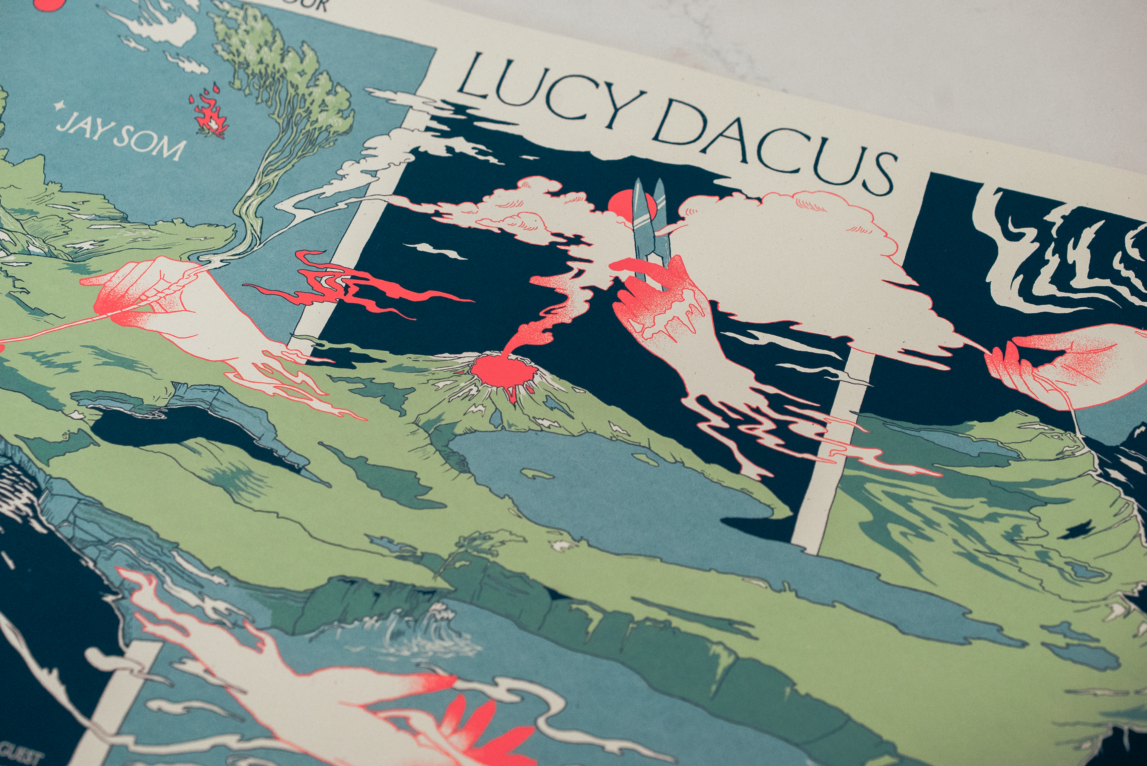 I designed and illustrated a horizontal triptych screen printed poster for Lucy Dacus's summer 2025 tour. Drawing inspiration from classical depictions of the Three Fates—who spin, measure, and cut the threads of destiny—I reimagined their raw material as a cartographic landscape, manipulated across the panels.