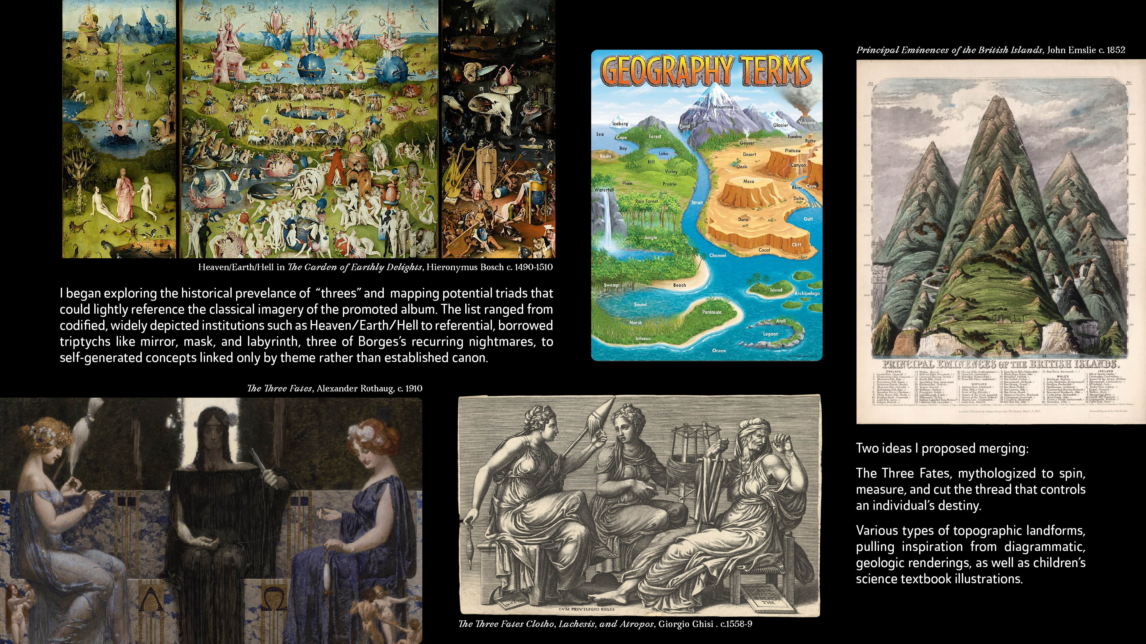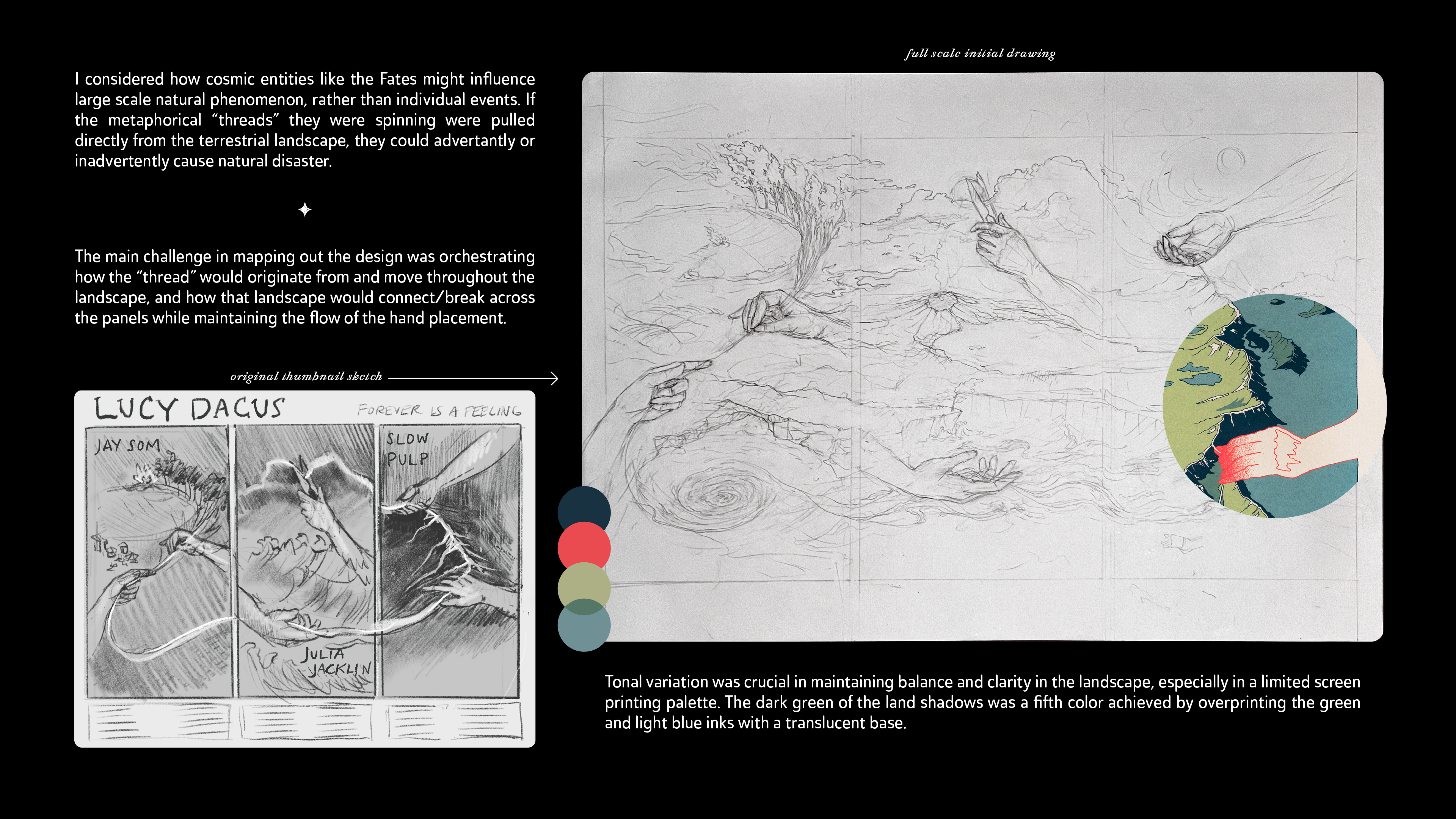 A commissioned triptych poster for Lucy Dacus's summer 2025 tour promoting her album "Forever Is A Feeling." Drawing inspiration from classical depictions of the Three Fates—who spin, measure, and cut the threads of destiny—I reimagined their hands manipulating a cartographic landscape, across the three panels.