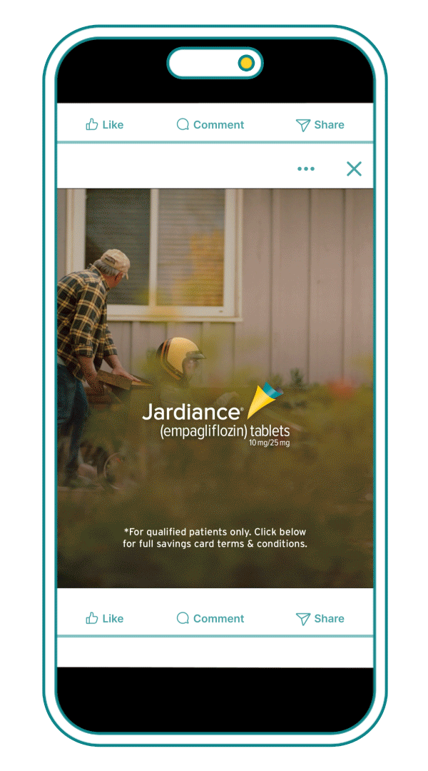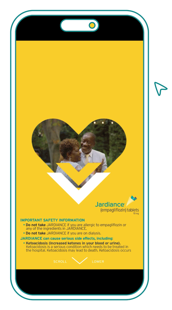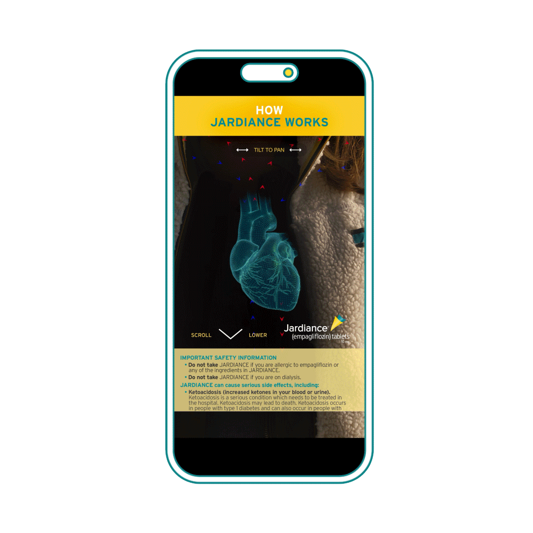 I collaborated with a small team of creatives to bring to life a series of Jardiance ads showcasing the MOA and benefits of the medication, including an interactive Facebook experience featuring seamless scroll and tilt-to-pan, as well as several in feed ads.