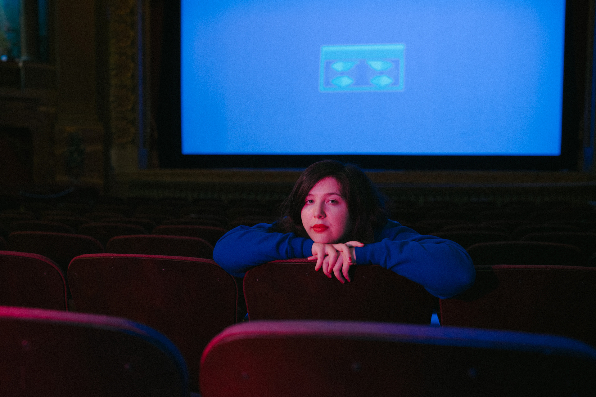 I shot the cover art on medium format film at a local historic theatre called the Byrd, a landmark in the artist's home town. The VHS icon, album's mascot, was projected on screen in the theatre while the artist sat in the audience, moving during the exposure to distort her image.