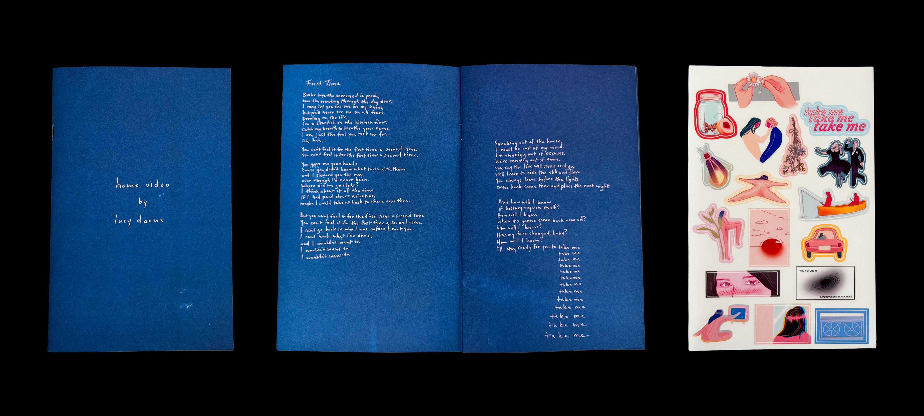 The illustrative, wistful, and feminine language of Home Video often contrasts the more eerie, fraught subject matter it depicts. The color palette primarily centers around blues and pinks, highlighting the iconic blue of early technological screens.